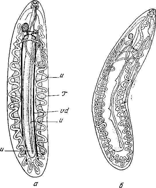 Обозначения: a—марита (по Фурману, 1928); и — матка; T —семенник; vd—желточный проток; б — марита (по Розалесу, 1951).