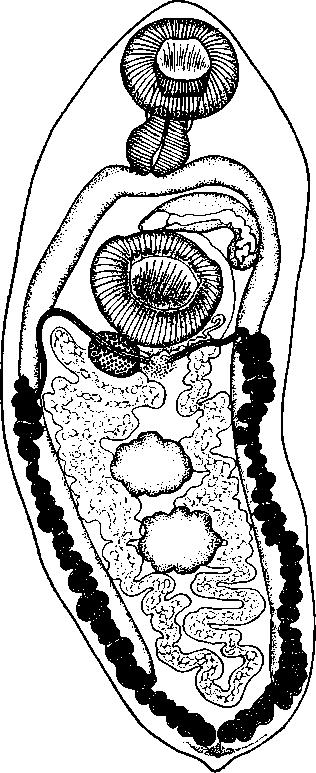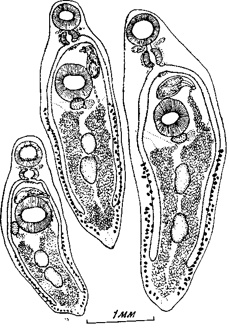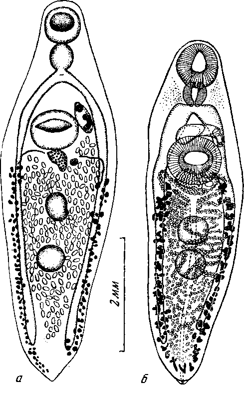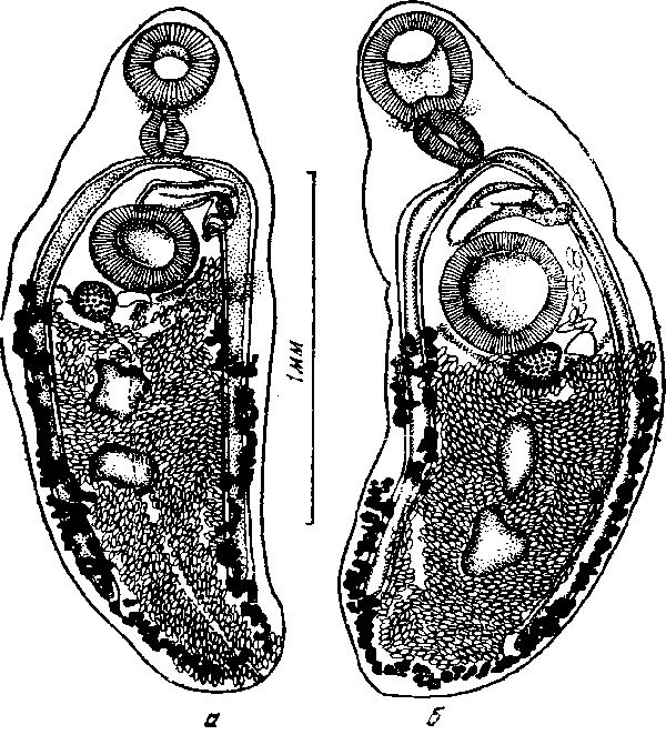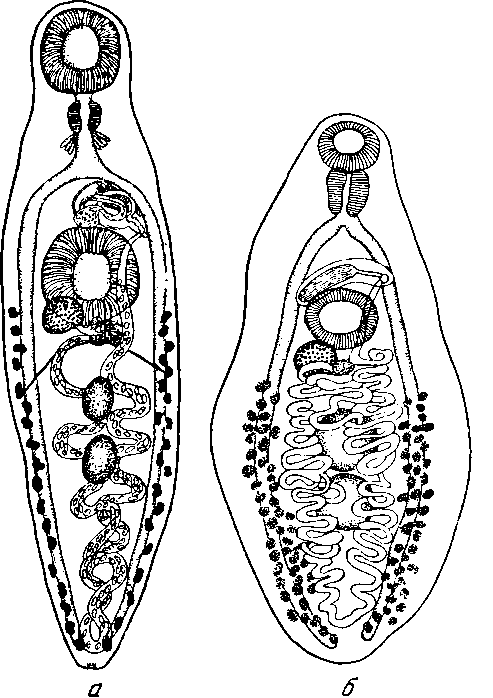 a — марита, описанная под именем Orthorchis natricis Modlinger, 1924 (по Медлингеру, 1924); б — марита, описанная под именем Distomum subflarum Sonsino, 1892 (по Дольфю, 1924)