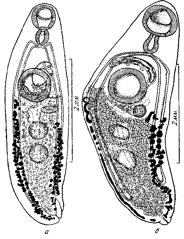 Описана под именем Paraplagiorchis timopheevi Dollfus, 1924; a — марита с компактной половой бурсой; б — марита с половой бурсой в виде арки.