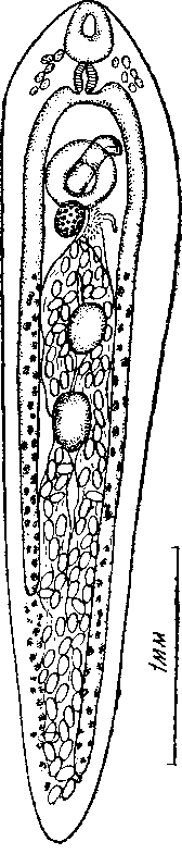 Кроме того, у чрезвычайно крупного метацеркария E. asyrnmetrica мелкие желточные фолликулы расположены по наружному краю каждого кишечного ствола от верхней границы переднего семенника и сливаются у заднего конца тела.