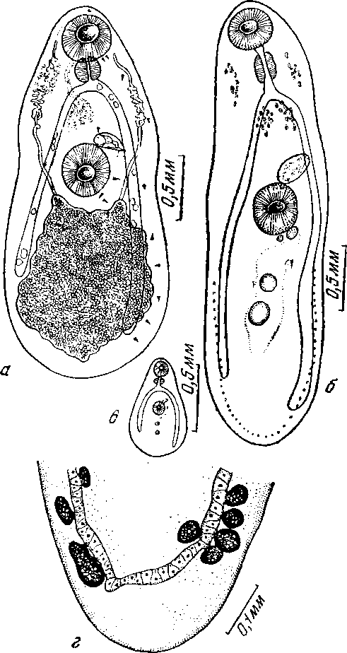 a —метацеркарий, вышедший из цисты; б — самый крупный метацеркарий; в — самый мелкий метацеркарий; г — задний конец мариты, видно соединение двух желточных протоков.