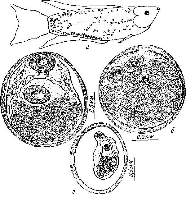 а - рыба Maciopodus opercularis, зараженная цистами с метацеркариями Encyclometra asymmetrica, б, в, г— цисты Encyctometra asymmelrica.