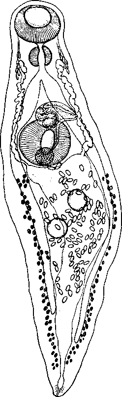 Объемистый экскреторный пузырь занимает почти все пространство между кишечными стволами, дорзально по отношению к матке; в переднем направлении он простирается до задней границы брюшной присоски, где от него отходят два широких собирательных сосуда. Эти сосуды пересекают кишечный ствол по вентральной стороне и извилистым путем идут вперед по направлению к фаринксу, около которого они резко суживаются и переходят в восходящий канал. Более детальное изучение экскреторной системы, в связи с ограниченностью материала, произведено не было.