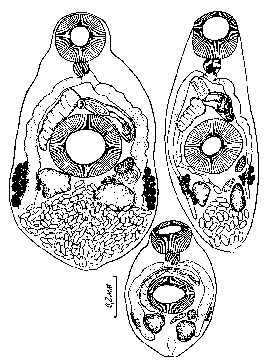 Брюшная присоска хорошо развита, располагается либо на середине тела, либо впереди середины тела, но в некоторых случаях брюшная присоска помещается большей своей частью позади середины длины тела; длина брюшной присоски достигает 0,183—0,531 мм при ширине 0,216— 0,714 мм.