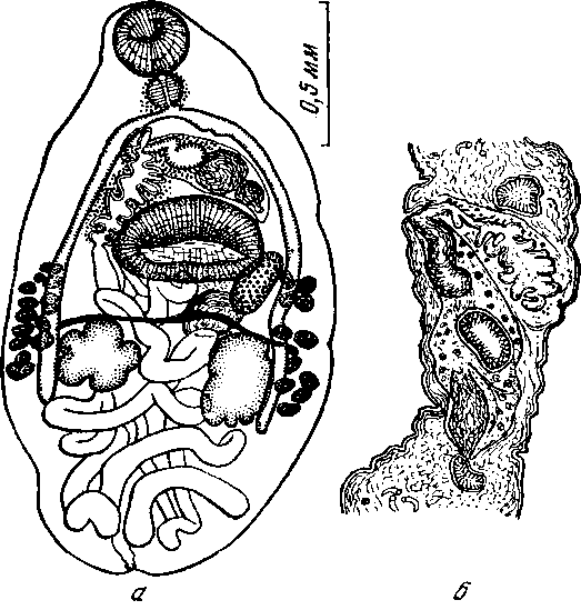 а — марита; б — срез в области концевого отдела половых протоков