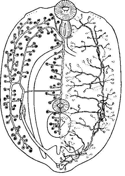 Метацеркарий. Строение первичной (левая половина тела) и вторичной экскреторных систем