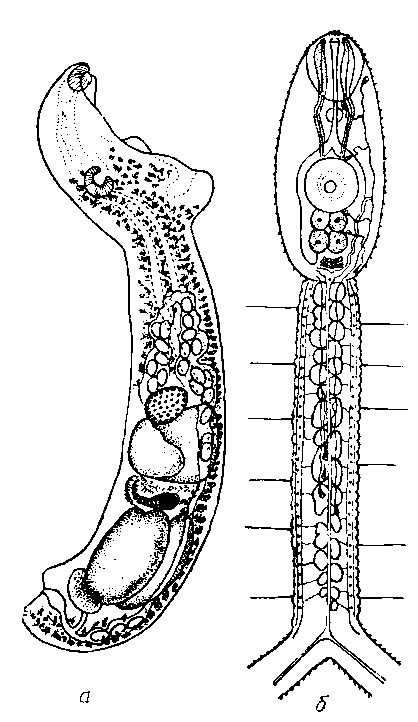 a — марита — по Гайтема, 1931; 6 — церкарий — по Корту и Бруксу. 1928.