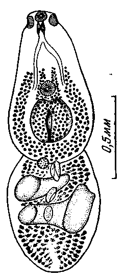Diplostomum vanelli Yamaguti, 1935 (по Ямагути, 1935).
