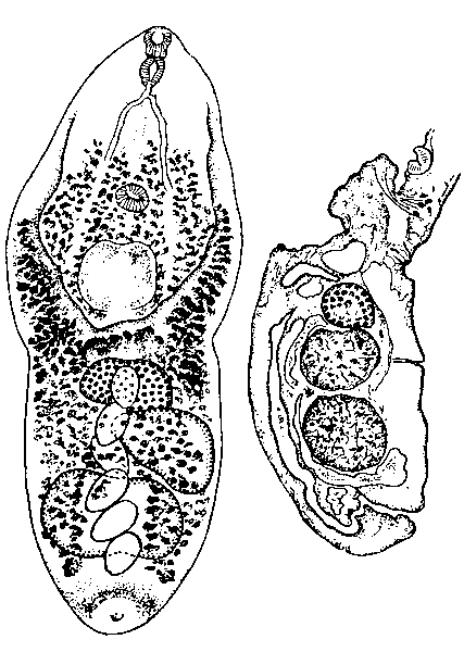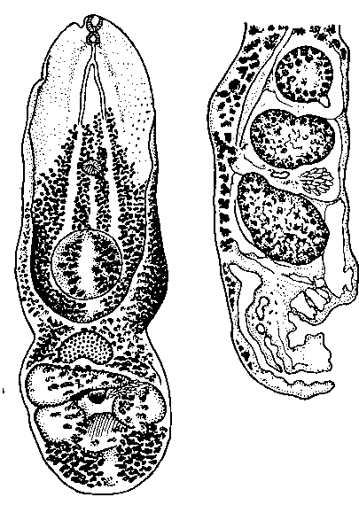 В переднем сегменте они группируются вокруг органа Брандеса, проникая в его стенки; кпереди они простираются до уровня переднего края брюшной присоски; в заднем сегменте — спускаются до отверстия полового атриума. За семенниками фолликулы идут в виде двух полос. Поперечно-вытянутые семенники расположены один за другим позади яичника. Оба семенника лежат в передней половине заднего сегмента. Поперечный диаметр переднего семенника равен 0,22—0,35 мм, заднего — 0,25—0,29 мм. Передний семенник асимметрично развит. Семенной пузырек извитой, располагается позади заднего семенника. Семяизвергательный канал с мышечной стенкой. Генитальный конус отсутствует. Яйца 0,09—0,094 X 0,051—0,054 мм.