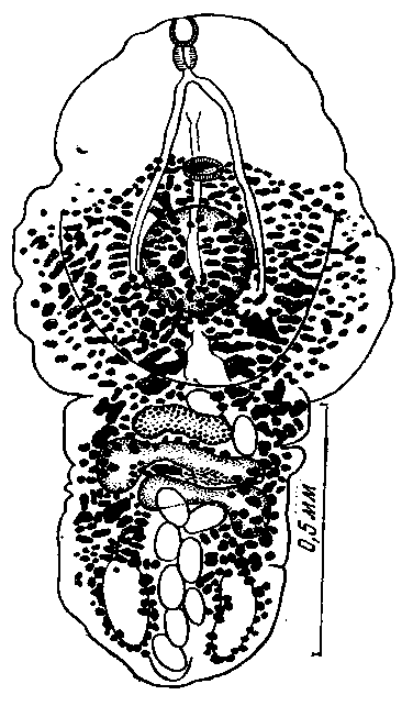 Субтерминальпая ротовая присоска 0,054—0,060 мм длины и 0,057 — 0,064 мм ширины. Размеры фаринкса 0,060—0,072 X 0,046—0,068 мм. Пищевод короткий (0,018—0,040 мм длины) или отсутствует. Кишечные стволы почти достигают заднего конца тела. Брюшная присоска расположена кпереди от середины переднего сегмента; ее размеры 0,050 X 0,065 мм.