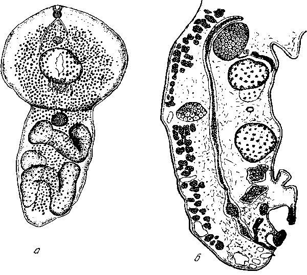 a — общий вид, б — сагиттальный срез заднего сегмента