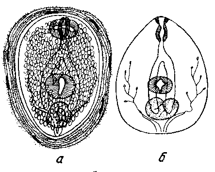 a — метацеркарий в цисте из печени обыкновенной полевки; б — из семенников водяной крысы