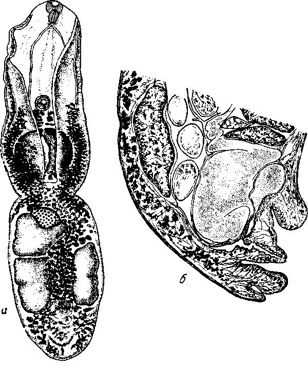 а — общий вид; б — сагиттальный срез заднего конца тела