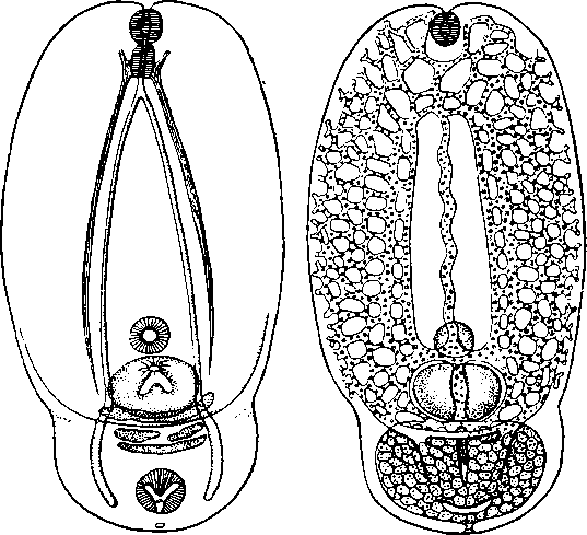 Ornithodiplostomum ptychocheilus (Faust, 1917) (по Хюгесу и Писчеку, 1928)