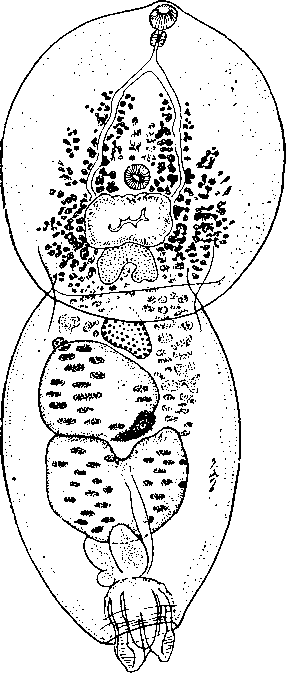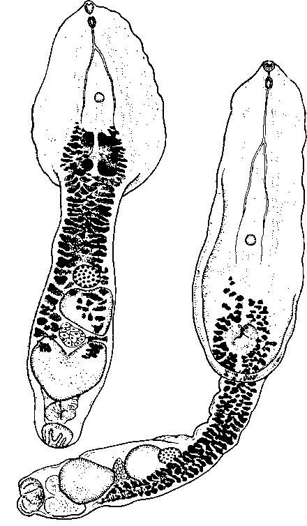 Posthodiplostomum bi-ellipticum Dubois, 1958 (по Дюбуа, 1958)