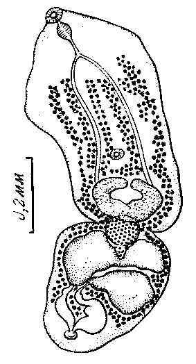 Posthodiplostomum grande (Diesing, 1850) (по Дюбуа, 1938)