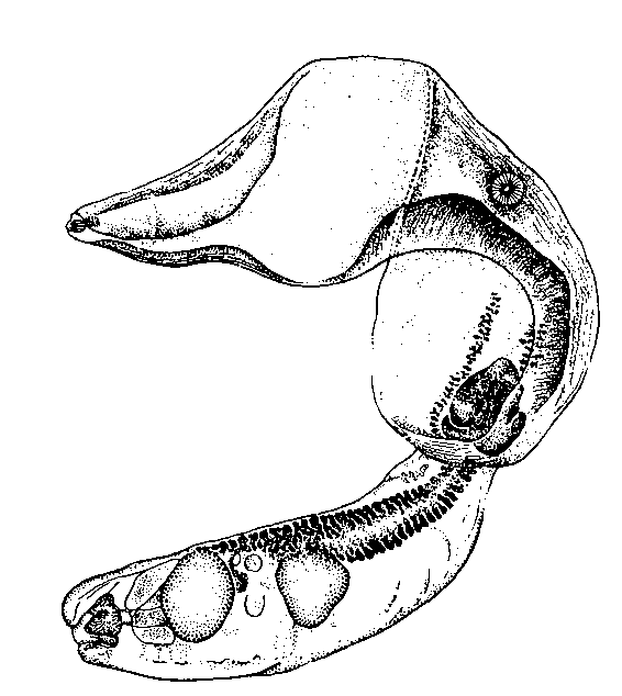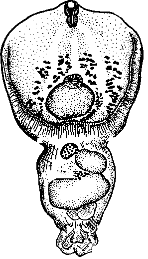 Поперечно-овальный яичник размером 0,035—0,050 X 0,054—0,090 мм расположен субмедианно на уровне межсегментарной границы. Передняя граница распространения желточников поднимается кпереди от брюшной присоски, задняя — не заходит за уровень заднего края семенников. Семенники различны по величине. Передний семенник сдвинут несколько влево от медианной линии тела; его размеры 0,075—0,126 X 0,090— 0,180 мм.