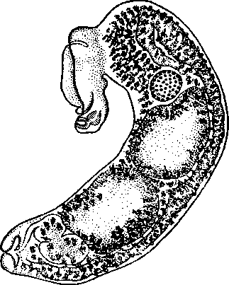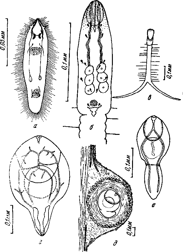 a — мирацидий, б, в — церкарий, г, е — метацеркарий, д — метацеркарий внутри цисты.