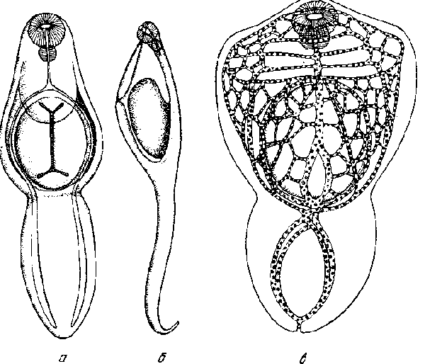 Метацеркарий, a — вентрально и б — латерально, в — расположение каналов вторичной экскреторной системы