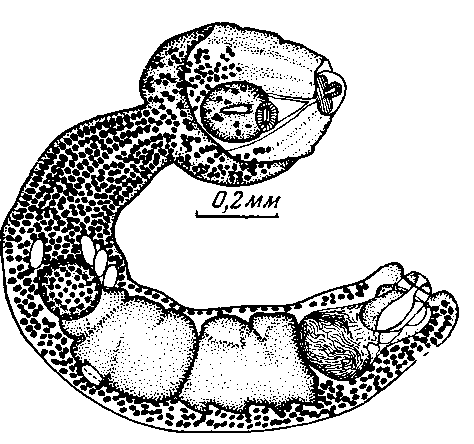 Яичник и семенники округлые. Они занимают последнюю треть или последнюю четверть длины заднего сегмента. Фолликулы желточников начинаются на расстоянии 1/6—2/5 длины сегмента и достигают почти заднего края тела, заполняя перед семенниками и позади них почти всю ширину тела, с вентральной и латеральных сторон. За семенным пузырьком следует семяизвергательная бурса, лежащая дорзально. Половое отверстие открывается субтерминально.