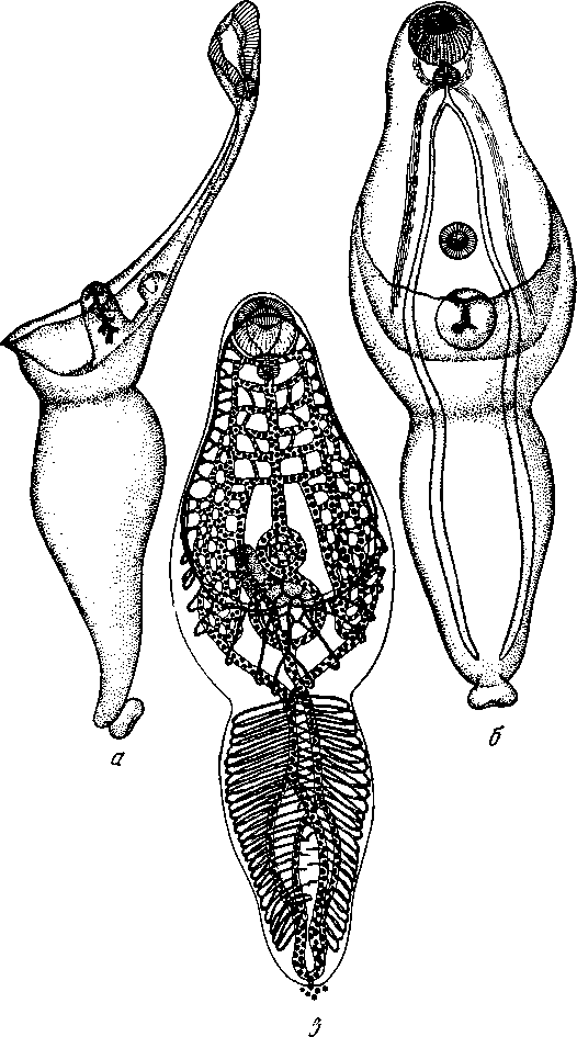 а и б —внешний вид метацеркария; (латерально и вентрально); в — расположение каналов вторичной экскреторной системы