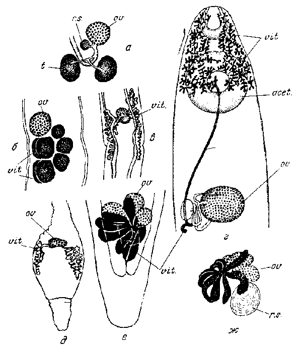 а — Hemiurus (Hemiurus) communis Odlmer, 1905; 6 —Lecilhophyllum sphaerolecithum (Manter, 1925); с —Pseudostomachicola magna (Manter, 1931); г — Guschanshiana alveolata (Robinson, 1934); д — Meroderus oligopllitis Manter, 1940; e — Lecithcister stellatus Looss, 1907; ж — Macradenina acanthuri Manter, 1947, Обозначения: aret.— брюшная присоска; ov — яичник; r.s.— семяприемник: vit.— желточники; t — семенники.