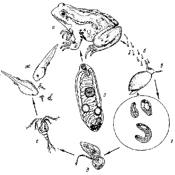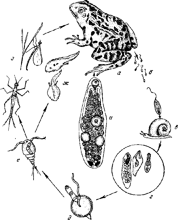 a — дефинитивный хозяин — лягушка рода Rana; б — яйца Н. amherstensis; в — промежуточный хозяин — моллюск Physa gyrina; г — отдельные стадии: мирацидий, спороциста и редия, развивающиеся в моллюске; д — церкарий цистофороидного типа; е — дополнительный хозяин — циклоп Cyclops viridis с метацеркариями в полости тела; ж — головастики лягушки рода Rana; а —марита Н. amherstensis.