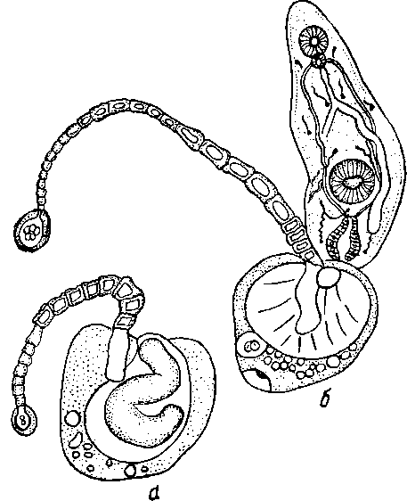 а — незрелый церкарий из тела редии; б — зрелый церкарий.