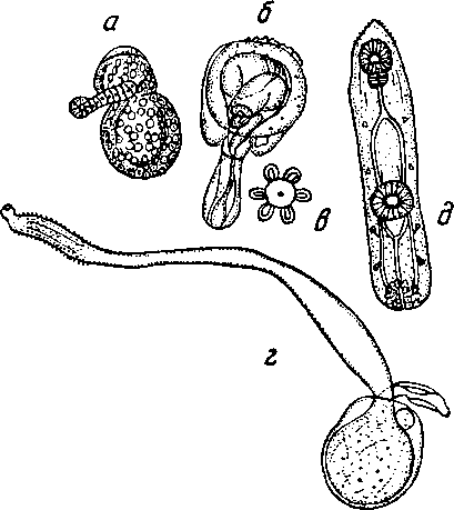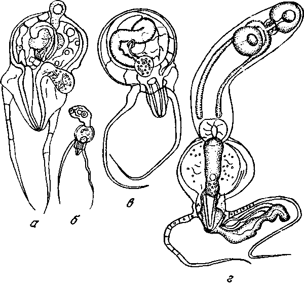 а — бульбус цистофороидного церкария с эксцистированным церкарием, экскреторный канал внутри бульбуса; б — эксцистированный и прикрепившийся церкарий; в —цистофороидный церкарий вскоре после выхождения из хозяина —моллюска; г — эксцистированный церкарий с вытянутым экскреторным каналом.
