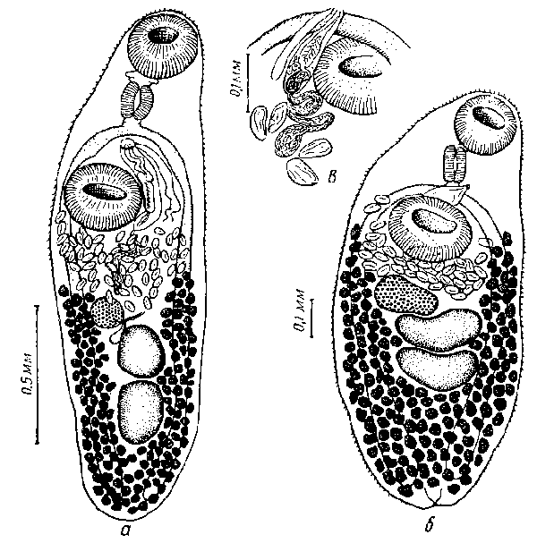 а и б — марита, в — половая бурса и наружный семенной пузырек