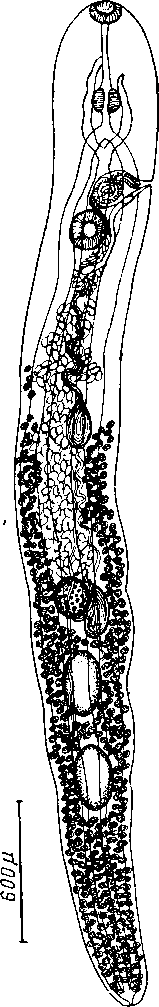 Яйца многочисленные, удлиненно-овальные, с тонкой оболочкой и утолщением на одном из полюсов; после фиксации в алкоголе и при измерении в воде они достигали 0,047—0,054 X 0,030—0,033 мм. Желточники состоят из сравнительно маленьких, круглых фолликулов, простирающихся вдоль кишечных стволов от уровня задней части наружного семенного пузырька до заднего конца тела; они заходят в пространство между яичником и передним семенником, а также между семенниками, как с вентральной, так и с дорзальной стороны; позади заднего семенника желточники сливаются. Желточный резервуар 0,060 мм ширины; у типичного экземпляра он расположен дорзально по отношению к яичнику и позади него.