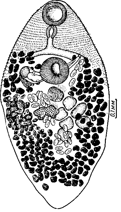 Семенники расположены двумя латеральными розетковидными группами, в средней трети тела. Яичник лежит позади семенников - Multitestis nasusi Bravo-Hollis et Brenes, 1959.