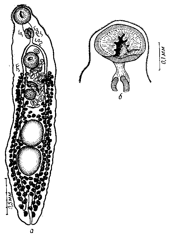 a — марита (по Мантеру, 1947); б — строение ротовой присоски (по Браво-Холлис и Мантеру, 1957)
