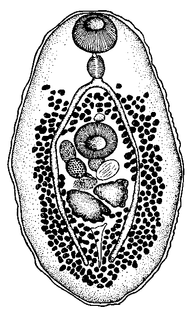 Желточные фолликулы большие, лежат тесно друг к другу, заполняют большую часть тела от уровня задней половины ротовой присоски до заднего конца тела; они расположены дорзально, вентрально и латерально по отношению к кишечным стволам, сливаются на уровне фаринкса и позади семенников. Желточный резервуар находится между яичником и передним семенником. Яйца большие, немногочисленные, с тонкой оболочкой, 0,084—0,100x0,050—0,063 мм. Экскреторное отверстие расположено на заднем конце тела; экскреторный пузырь тонкостенный, короткий, простирается до уровня заднего семенника.