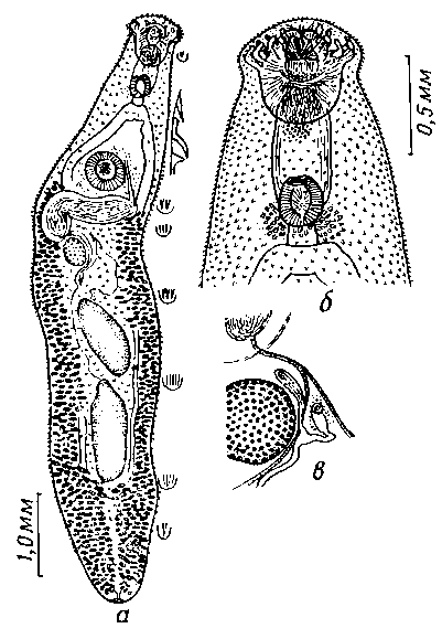 a — марита вентрально; б — передний конец; в — яичник и лауреров канал