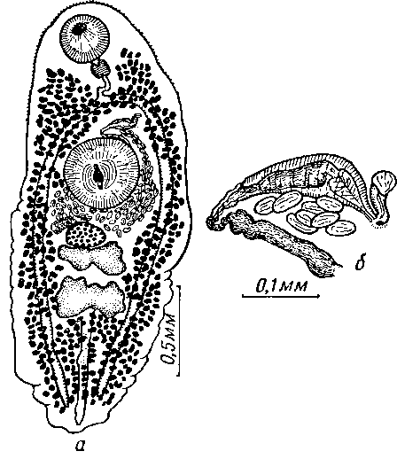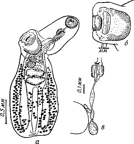 а — марита; б — строение брюшной присоски; в — терминальный участок полового аппарата