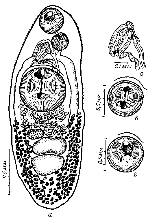 а - марита; б — терминальный участок полового аппарата; в и г — строение брюшной присоски