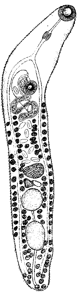 Семяпримник овальный, расположен позади яичника и дорзально от него, влево от медианной линии тела, между яичником и передним семенником, 0,117—0,345 мм длины и 0,097—0,227 мм ширины. У сокращенных экземпляров семяприемник частично налегает на левую часть яичника.