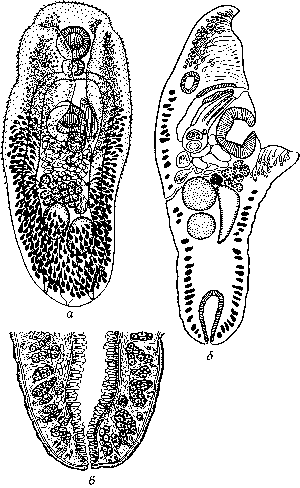 a — марита; б — сагиттальный срез мариты, видны половое отверстие и анус; в — срез через анус