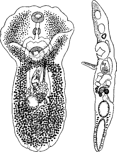 Семяприемник лежит антеро-дорзально по отношению к заднему семеннику и открывается в яйцевод своим передним концом. Лауреров канал берет начало из протока семяприемника, рядом с яйцеводом, и открывается на дорзальной поверхности на уровне середины заднего семенника. Матка короткая; ее немногие петли ограничены пространством между яичником, половой бурсой и кишечными стволами. Терминальная часть матки, метратерм, идет прямо вперед на левой стороне половой бурсы и открывается в половой синус; его стенка состоит из толстой кутикулы, окруженной железистыми клетками.