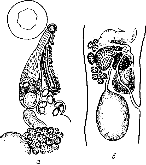 a — срез через половую бурсу; б — комплекс женских половых органов и семенник