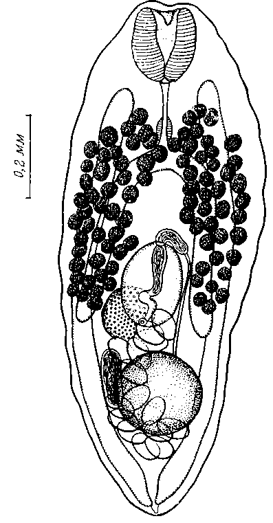 Яичник расположен впереди семенника, справа от медианной линии, в передней части задней половины тела. Он шаровидной формы, цельнокрайный, достигает 0,135 мм и 0,104 мм в диаметре. Имеется удлиненный семяприемник, лежащий позади яичника и частично дорзально справа от семенника. Желточные железы в форме крупных шаровидных фолликулов занимают большую часть передних 2/3 тела, располагаясь от заднего края ротовой присоски до уровня яичника. Матка тянется сначала назад, доходя до заднего края семенника, с его правой стороны, а затем описывает петлю в переднем направлении, прилегая вплотную к предыдущей. Яйца имеются в небольшом количестве: 8 и 15 у двух исследованных зрелых экземпляров. Они сравнительно крупные, овальной формы, достигая 0,081—0,09 х 0,05—0,086 мм.