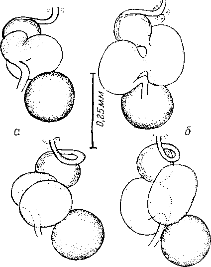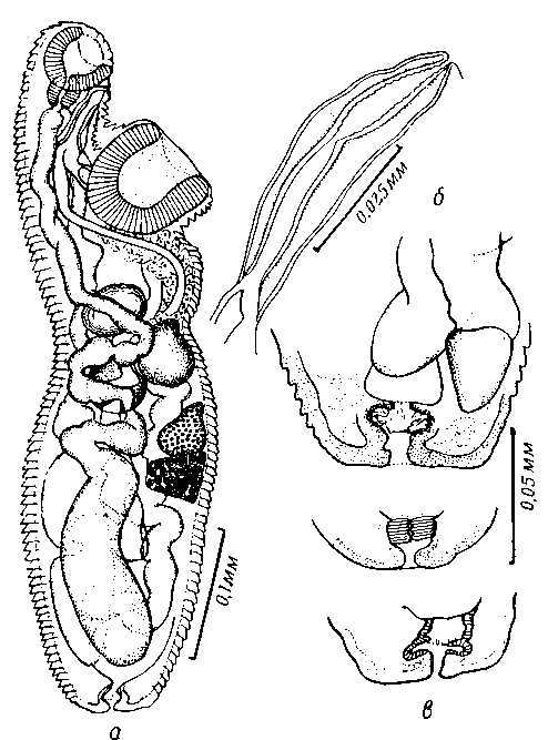 а — марита; б — гермафродитная бурса; в — экскреторное отверстие у отдельных экземпляров