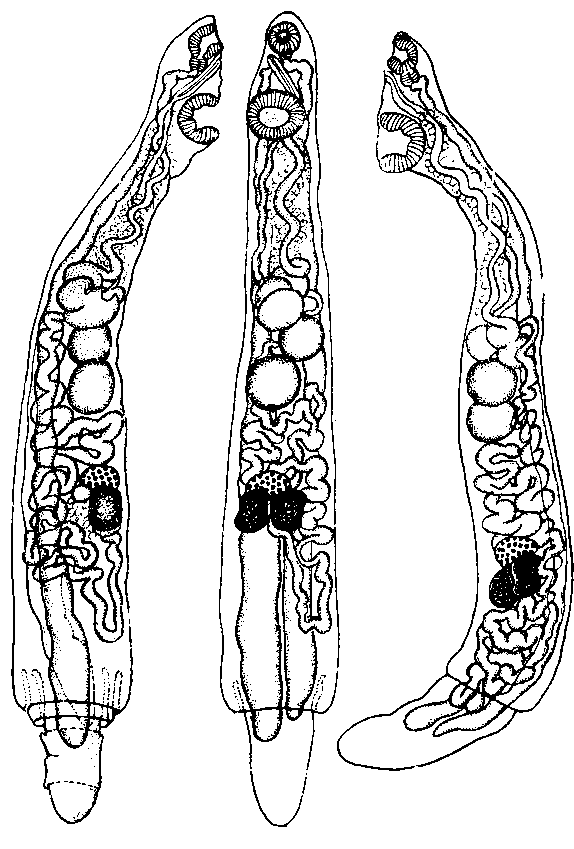 Hemiurus (N.) raabei Slusarski, 1958 (по Слюсарскому, 1958) Мариты с вентральной, правой и левой сторон