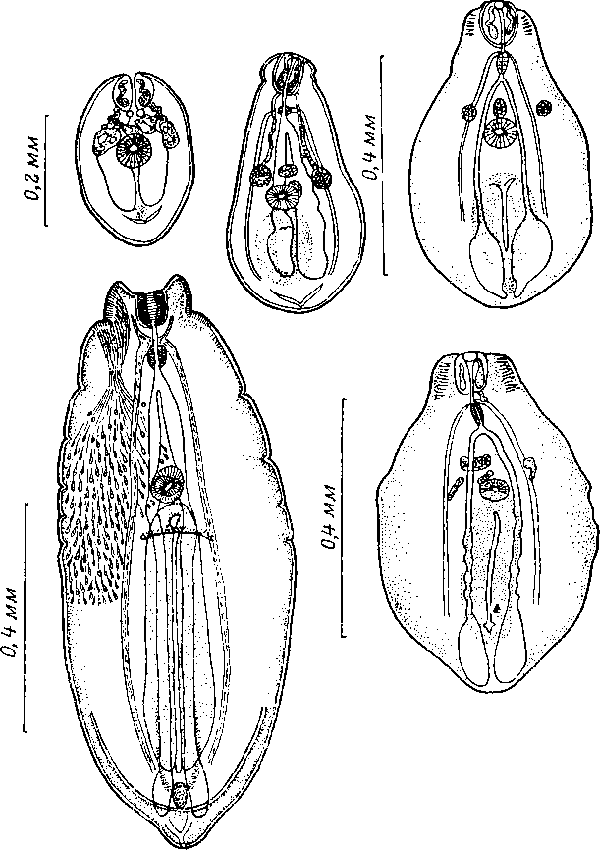 Гибкие, подвижные, способные втягиваться ушковидные придатки располагаются по сторонам ротовой присоски. Вытянутые они достигают 0,071—0,110 мм длины. Проздетические железы расположены по сторонам переднего сегмента в пространстве между уровнем середины органа Брандеса и уровнем фаринкса. Фаринкс 0,044—0,065 мм длины и 0,032— 0,044 мм ширины. Бифуркация кишечника начинается непосредственно позади фаринкса. Стволы кишечника почти достигают заднего конца тела. Размеры брюшной присоски 0,054—0,073x0,052—0,071 мм. Она лежит на расстоянии в 0,23—0,40 мм от переднего конца.