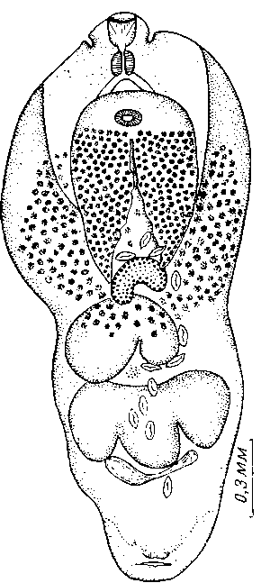 Узкий семяизвер-гательный канал переходит в крупную семяизвергательную бурсу, снабженную толстыми мышечными стенками. Толщина стенок бурсы равна 0,024—0,056 мм. Половой атриум маленький. Его отверстие открывается субтерминально на дорзальную сторону. Полость атриума в значительной части занята папиллой, основание которой лежит на задне-брюшной стенке атриума. Вершина папиллы направлена косо и вперед. У основания папиллы открывается короткий гермафродитный канал. Размеры яиц из матки 0,108—0,116x0,064—0,076 мм, из фекалий — 0,107—0,133 X 0,077—0,099 мм.
