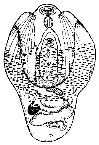 Описание мирацидия (по Одлаугу, 1940). Размеры тела 0,142x0,057 мм. Оно притуплено спереди и закруглено сзади. Поверхность тела покрыта ресничками. Два темных полулунных «глазка» лежат в его передней трети. Задняя часть тела содержит неправильной формы скопления герминативных клеток. Протонефридиев две пары. Одна пара расположена позади «глазков», другая пара — перед скоплениями герминативных клеток. Капилляры протонефридиев каждой стороны собираются в протоки, которые открываются по сторонам тела на уровне герминативных масс. Непарная «апикальная железа» расположена по оси тела между «глазками». Она идет от переднего конца тела до уровня передней пары протонефридиев. Остальная часть тела не несет органов и заполнена паренхиматозной тканью, образованной клетками мезенхимы и гранулами различной величины и формы.