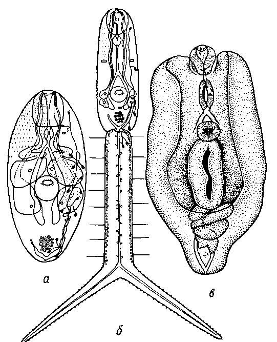 a — мезоцеркарии; б — церкарии; в — метацеркарий