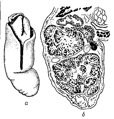 a — внешний вид мариты; б — сагиттальный срез заднего сегмента