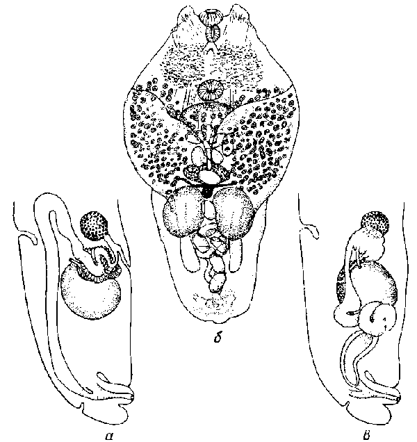 а - строение женской половой системы; б — марита; в — строение мужской половой системы